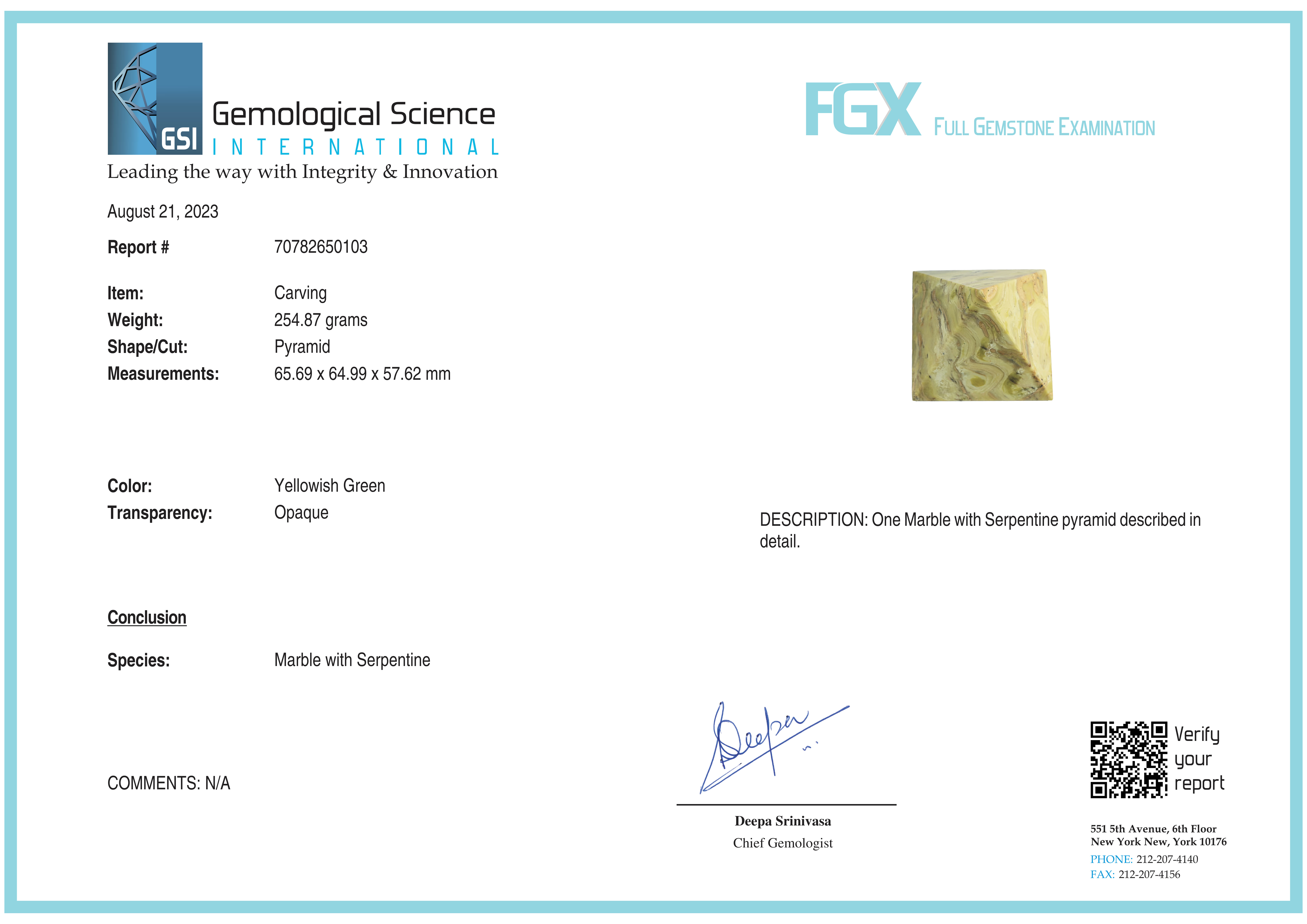 Natural Marble with Serpentine 254.87 grams Pyramid Carving GSI # 70782650103 New York Lab Certified