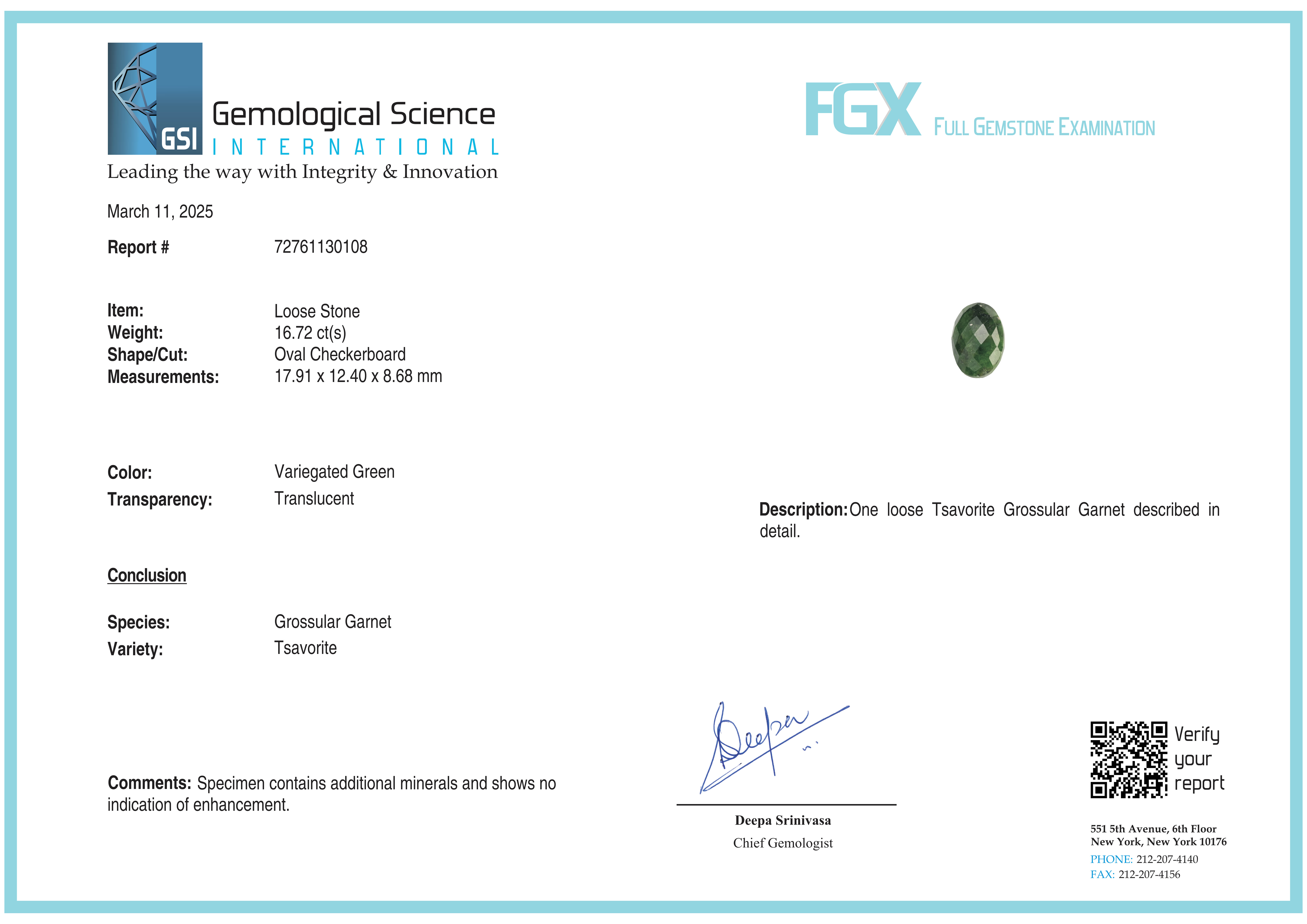 Natural Tsavorite 16.72 ct GSI # 72761130108 New York Lab Certified