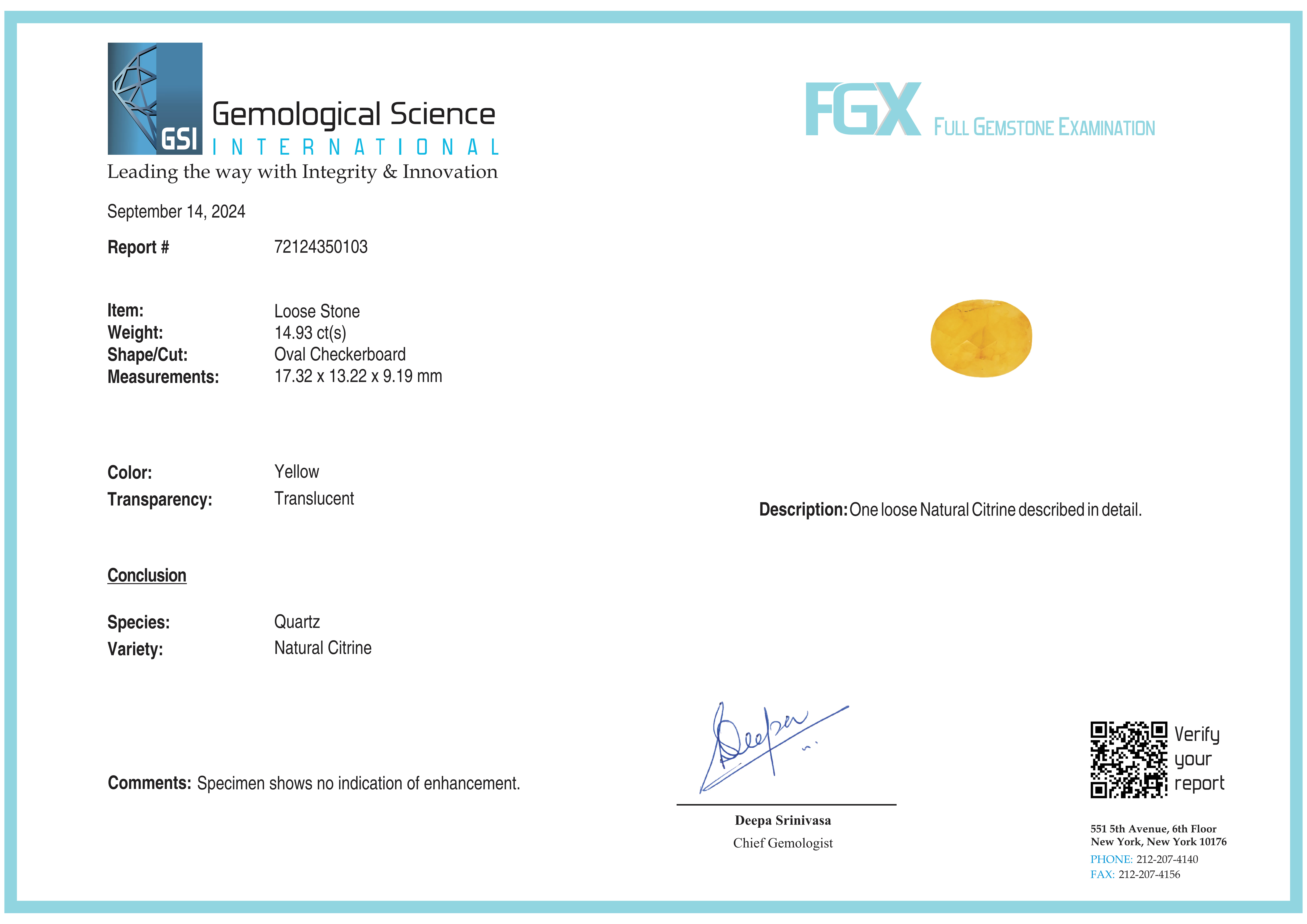 Natural Citrine 14.93 ct GSI # 72124350103 New York Lab Certified