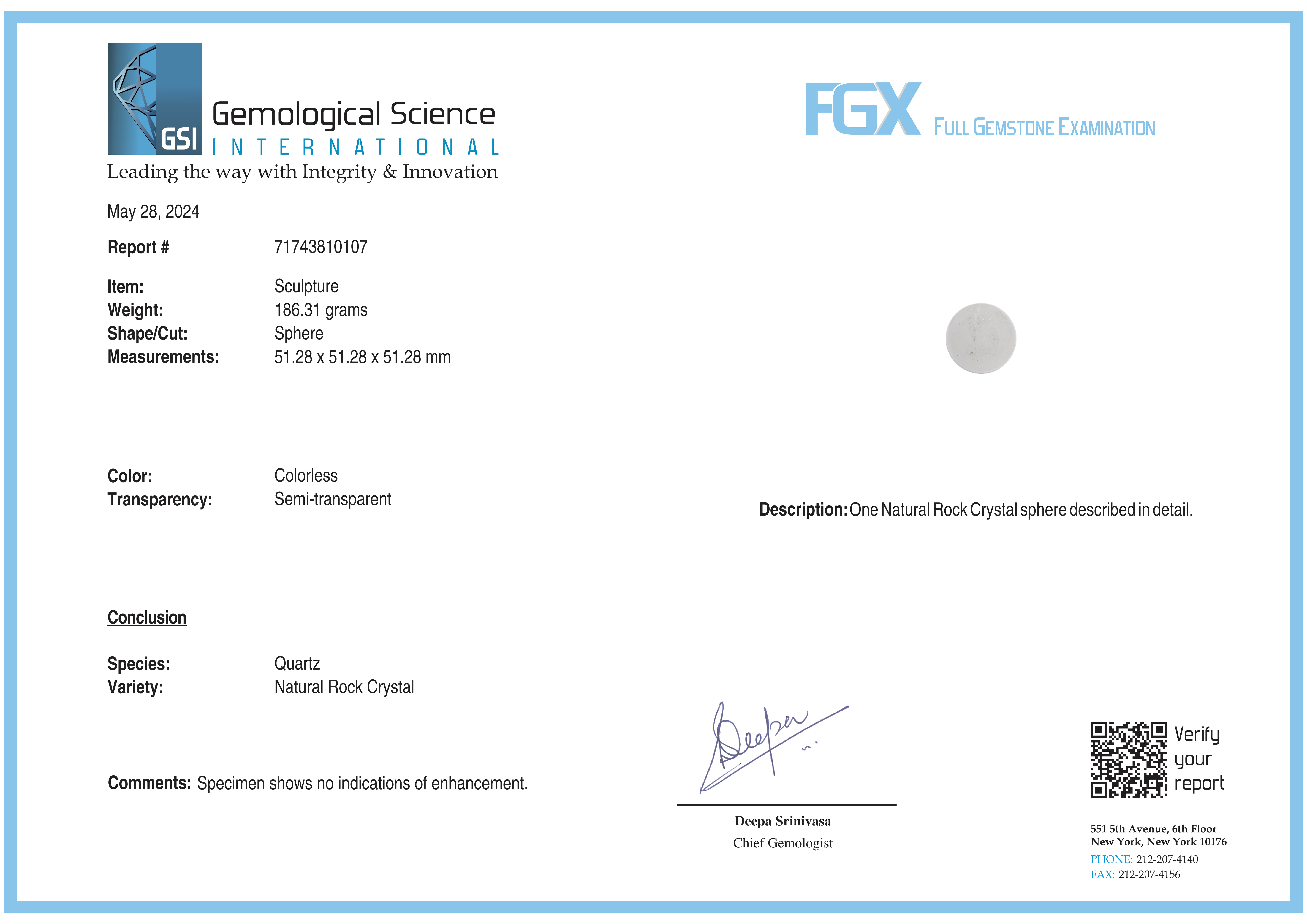 Natural Colorless Rock Crystal Sphere Sculpture 186.31 grams GSI # 71743810107 New York Lab Certified