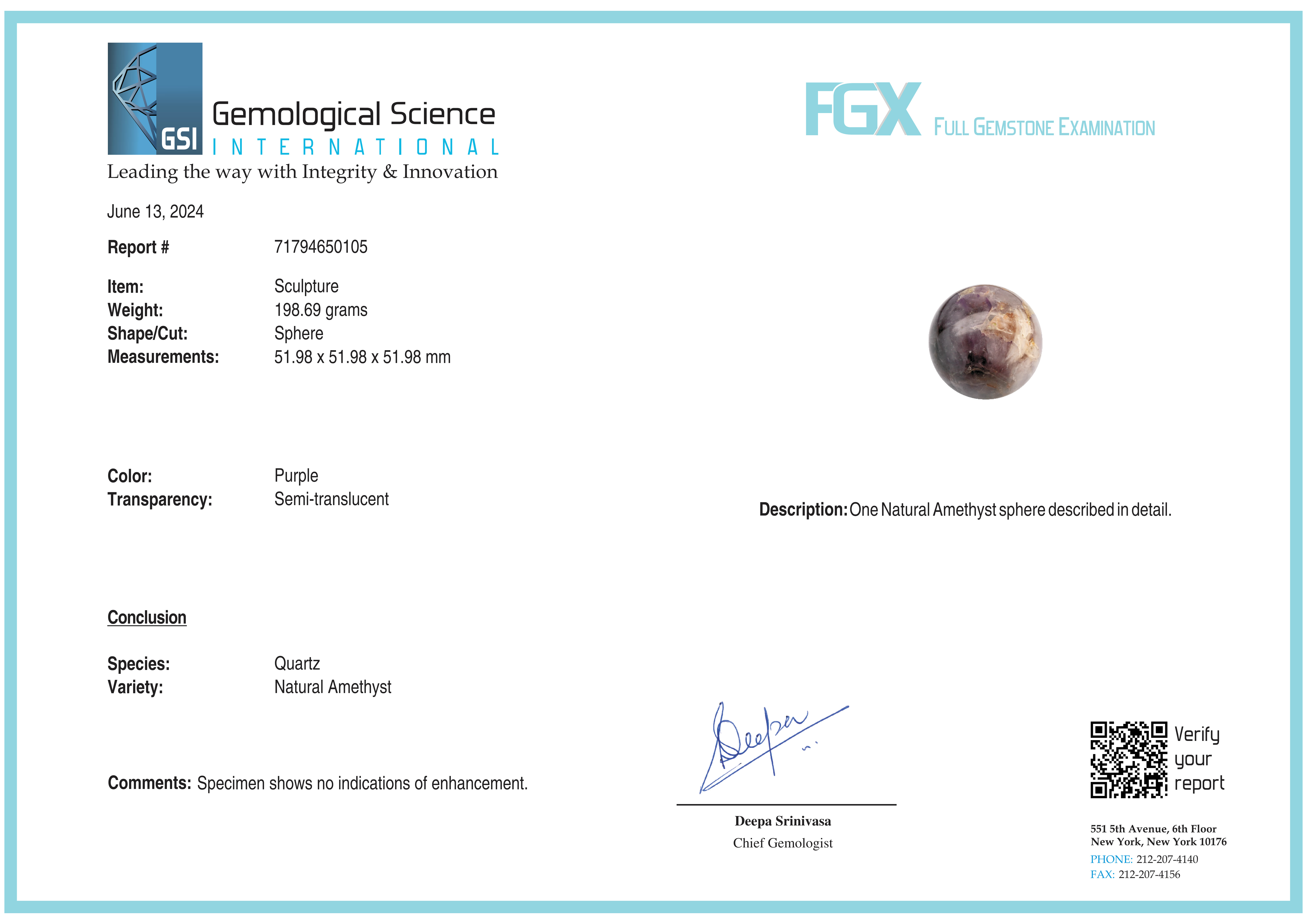 Natural Amethyst Sphere Sculpture 198.69 grams GSI # 71794650105 New York Lab Certified