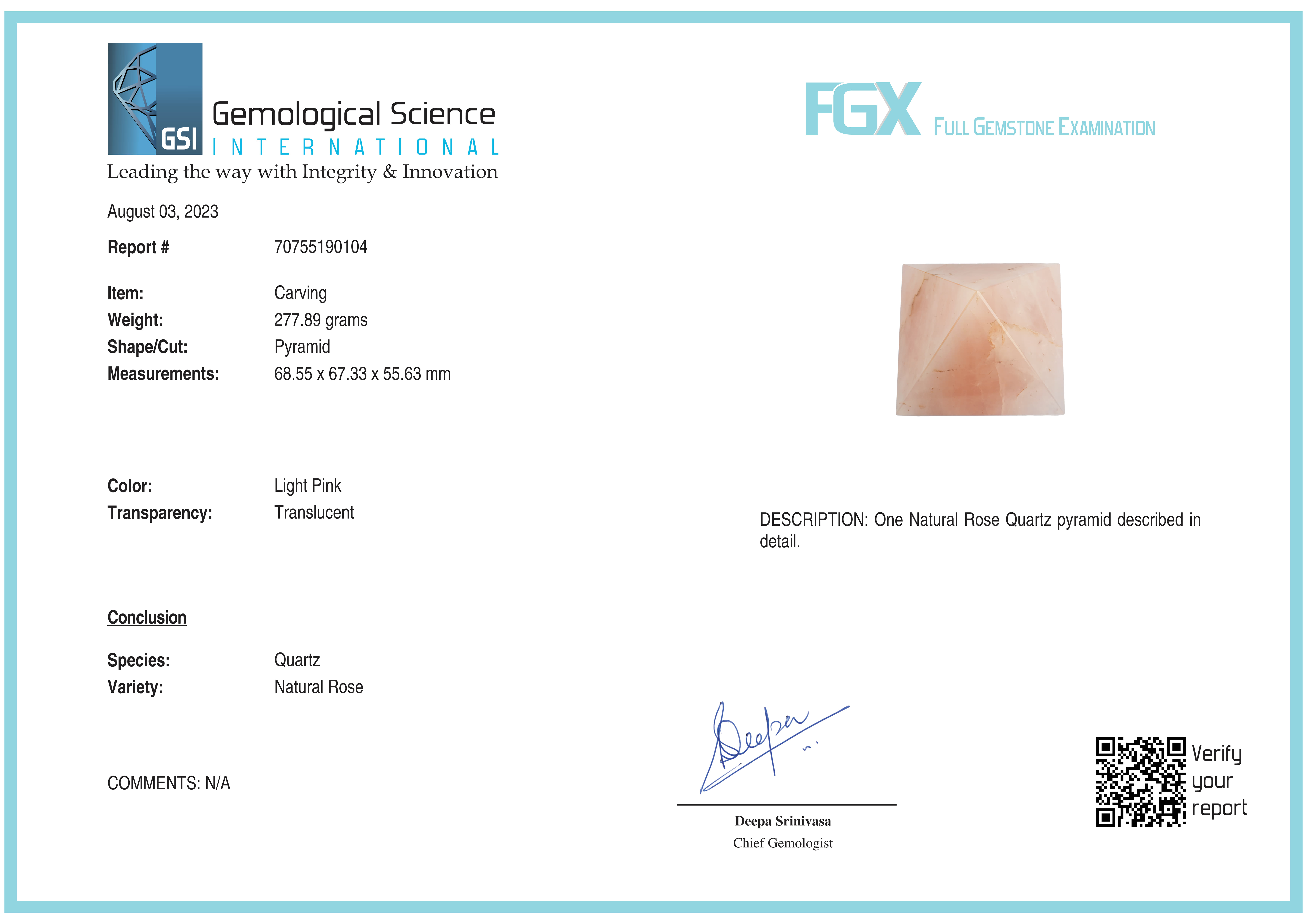 Natural Rose Quartz Pyramid Carving 277.89 grams GSI # 70755190104 New York Lab Certified