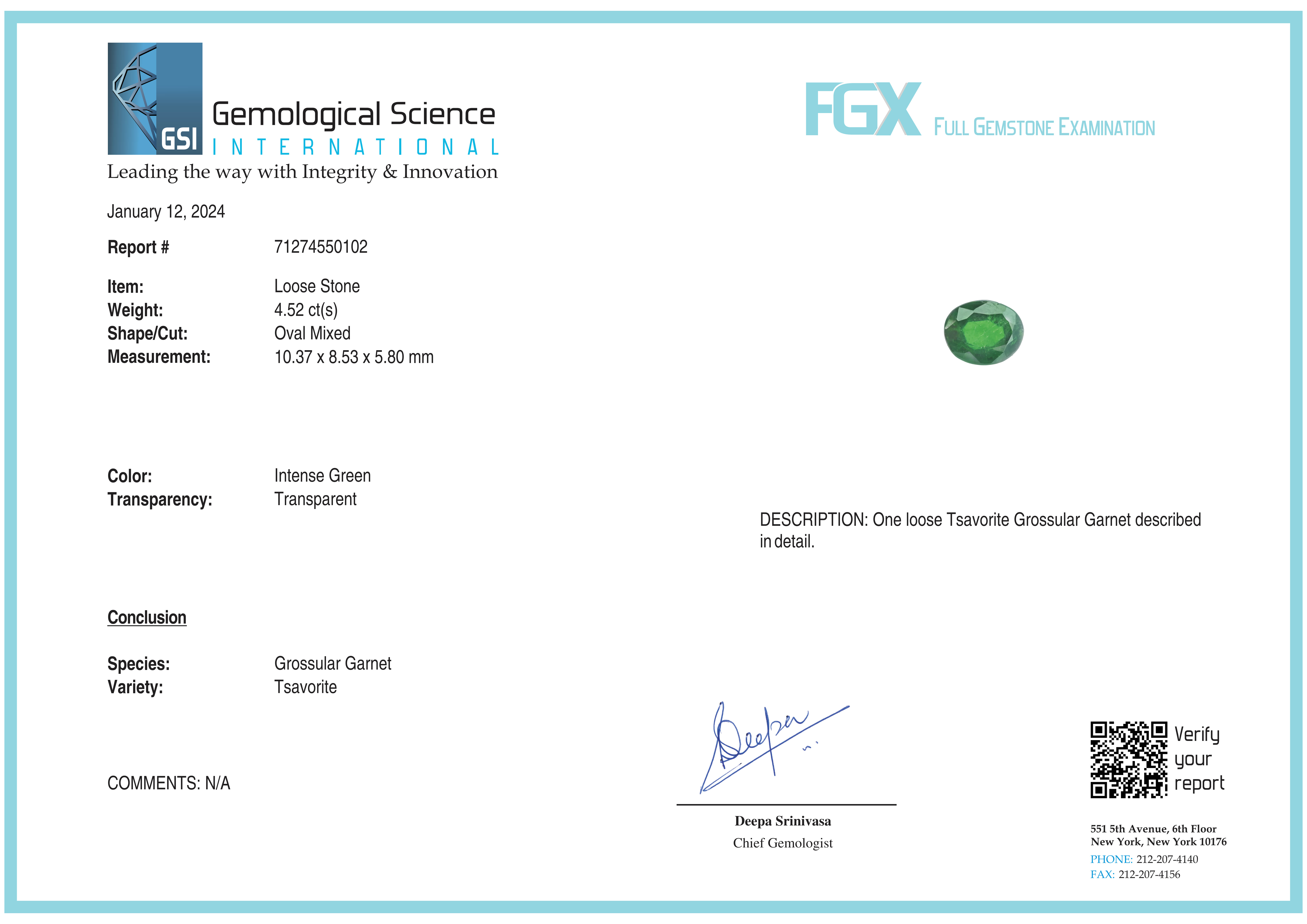 Natural Tsavorite High End Premium 4.52 ct IGI Lab # 613364897 with GSI # 71274550102 New York Lab Certified