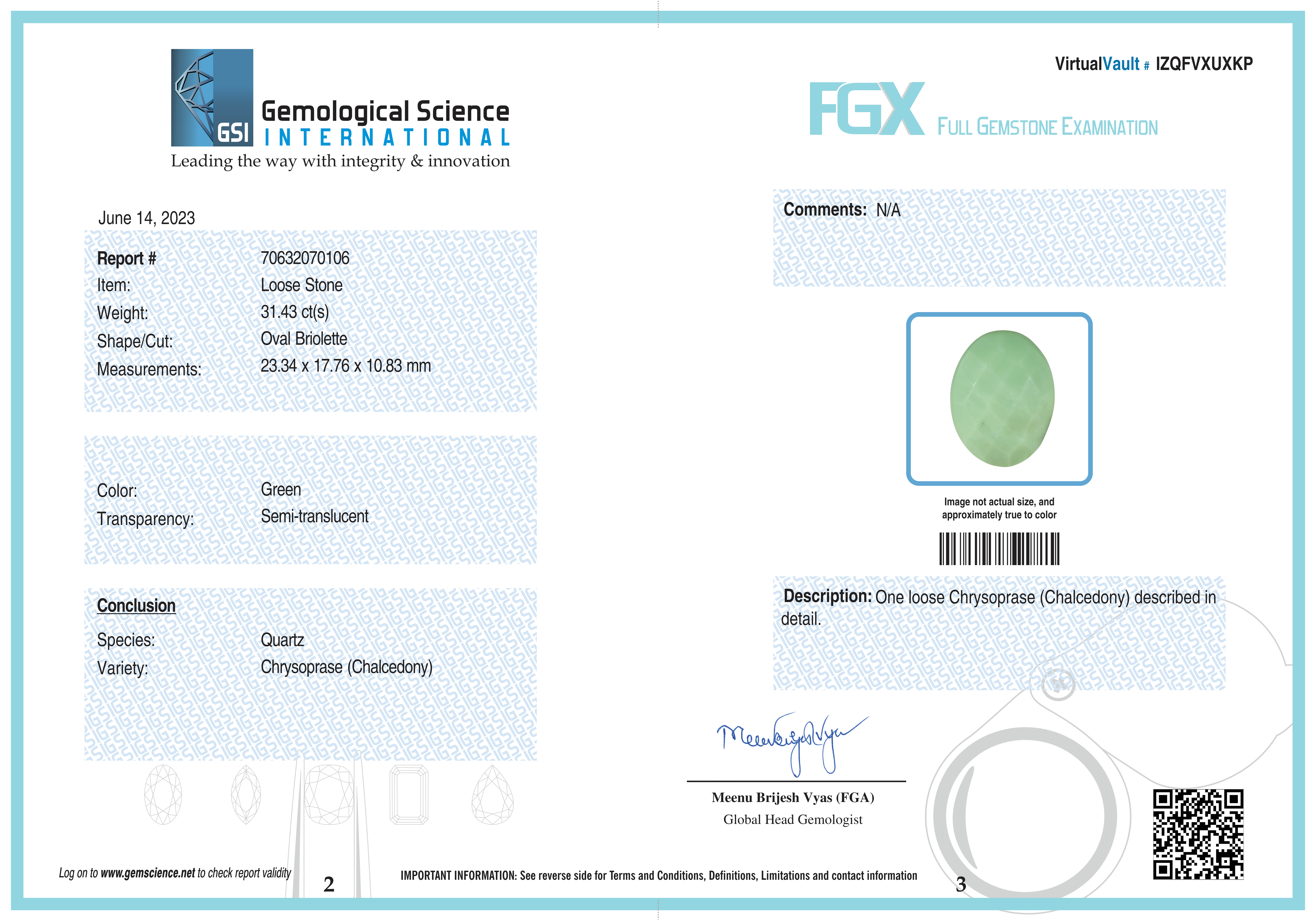 Natural Green Chrysoprase Chalcedony 31.43 ct GSI # 70632070106 New York Lab Certified