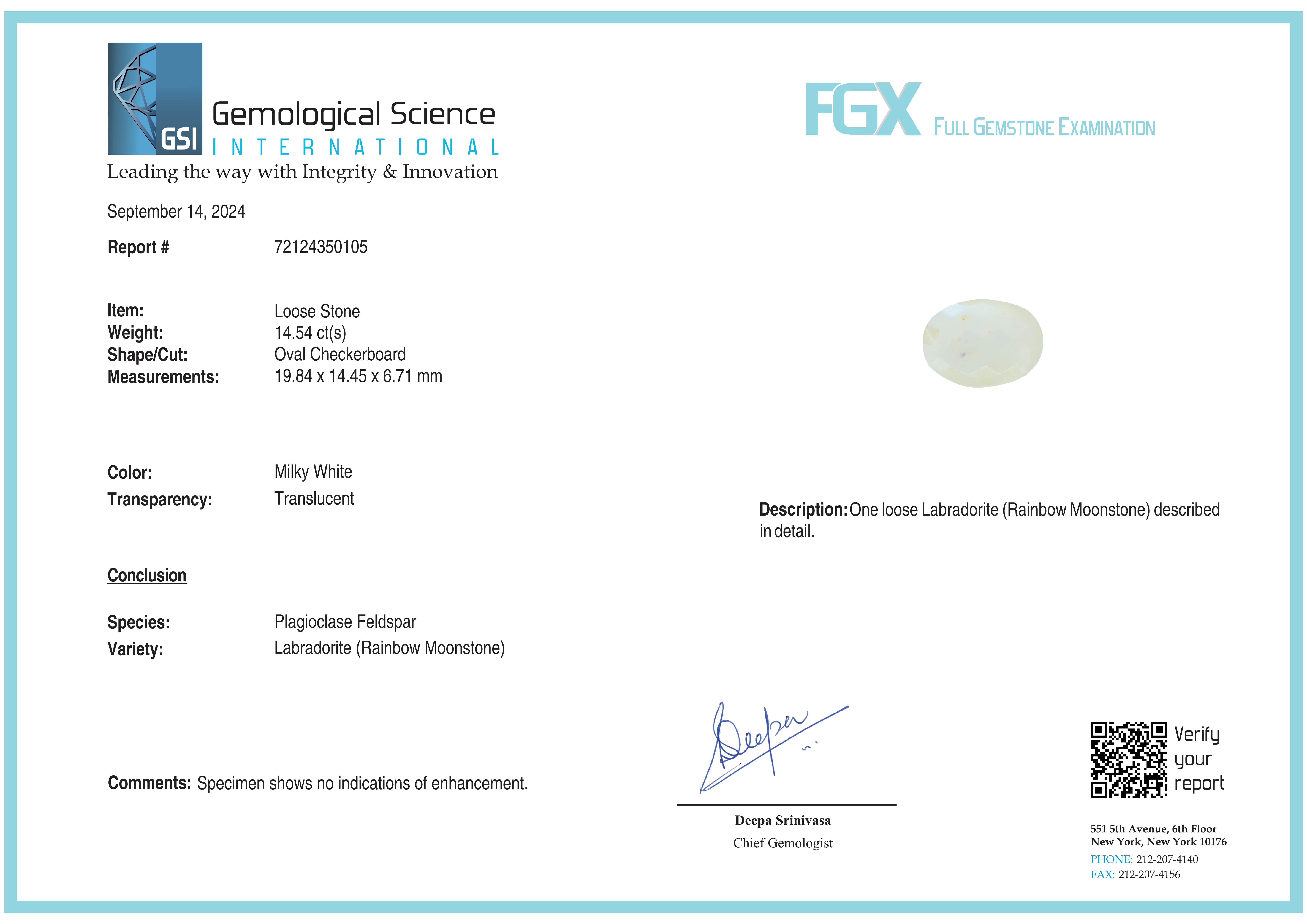 Natural Moonstone 14.43ct GSI # 72124350105 New York Lab Certified