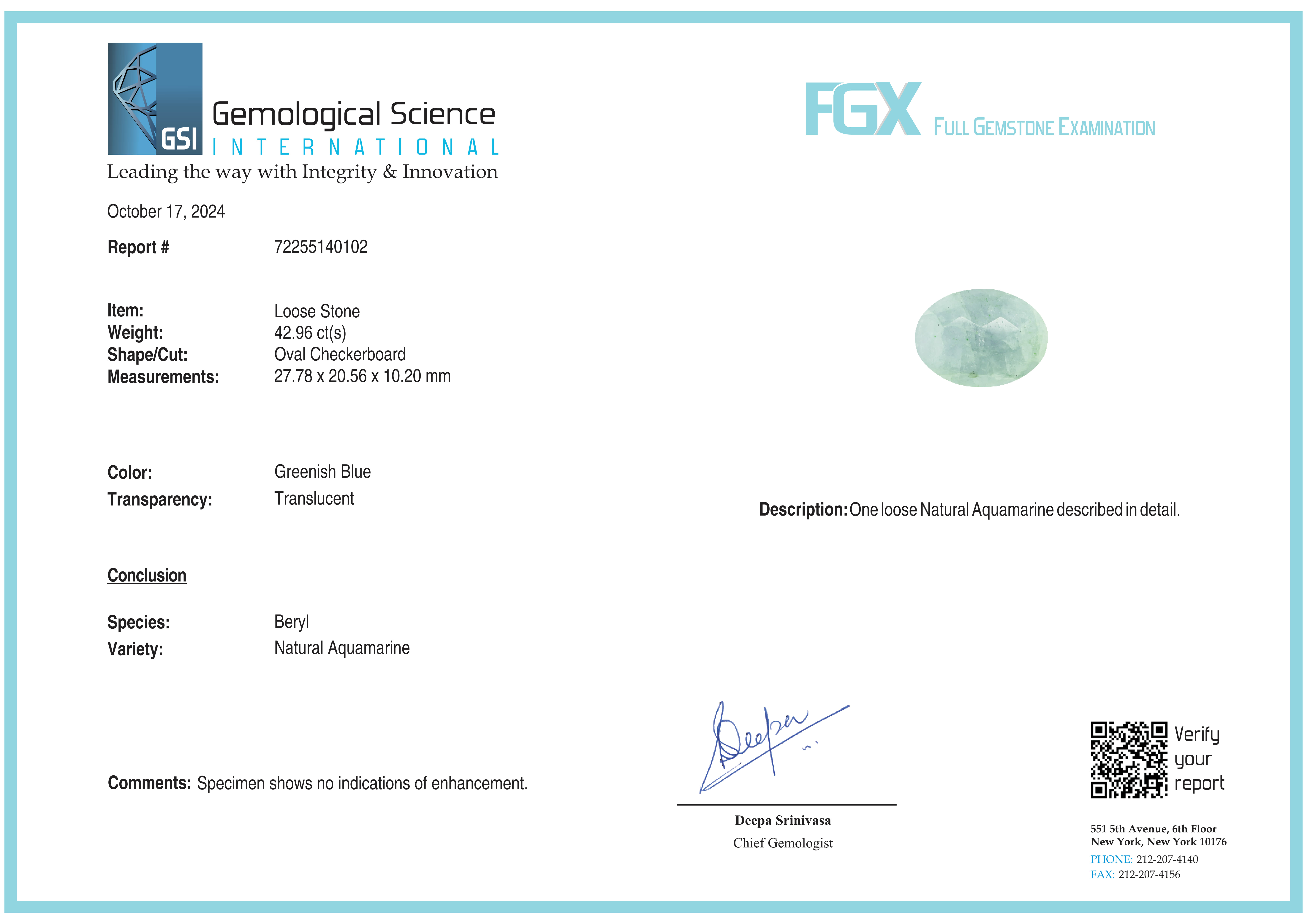 Natural Aquamarine 42.96 ct GSI # 72255140102 New York Lab Certified