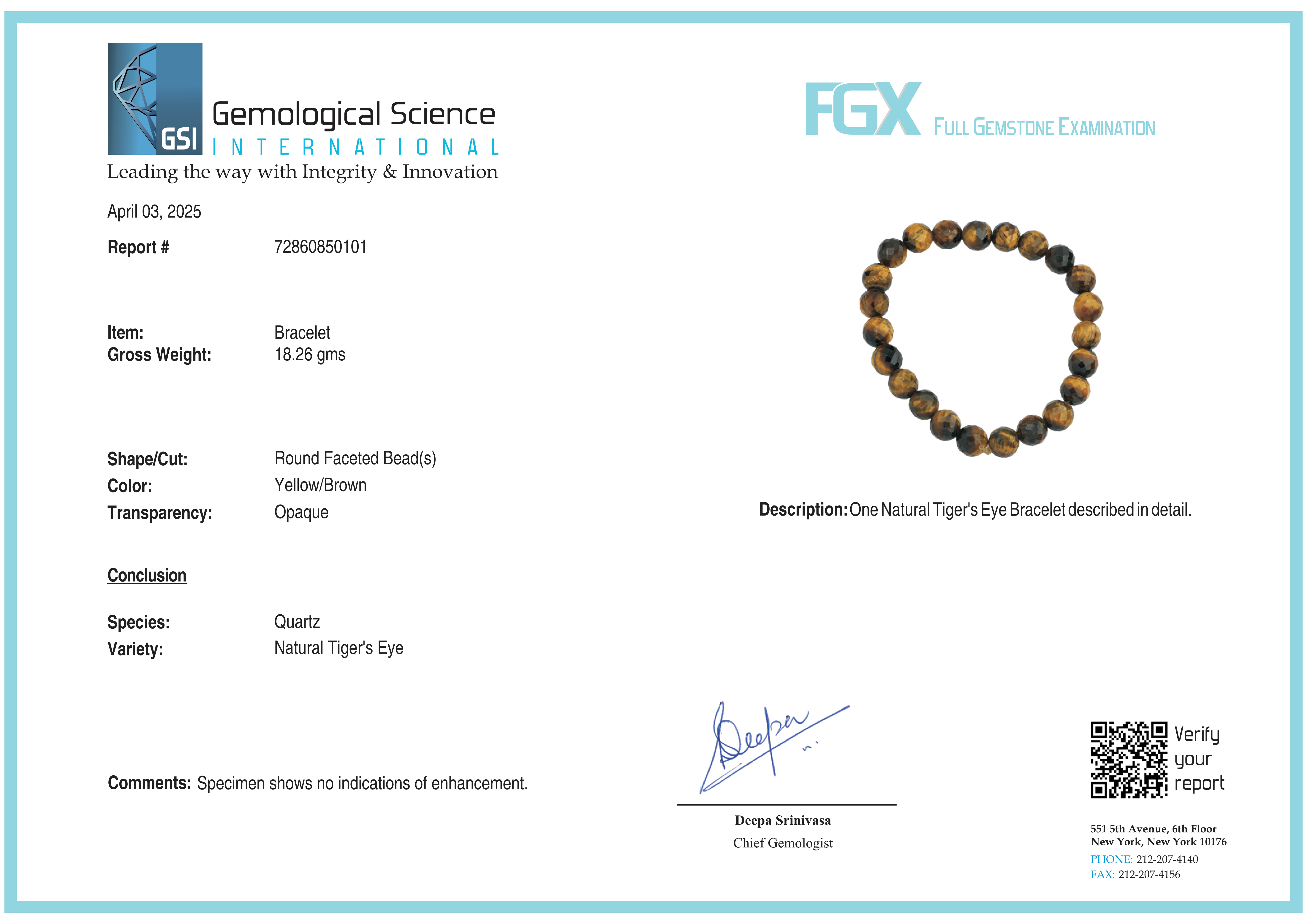 Natural Tigers Eye Bracelet 18.26 grams GSI # 72860850101 New York Lab Certified
